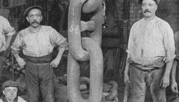 На снимке изображена массивная якорная цепь корабля «Титаник»,..