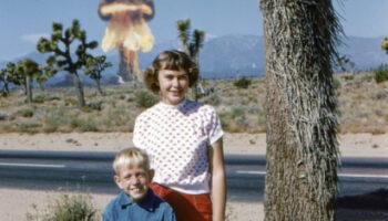 Невада, 1960-е годы. На заднем плане — испытание ядерного заряда, а..