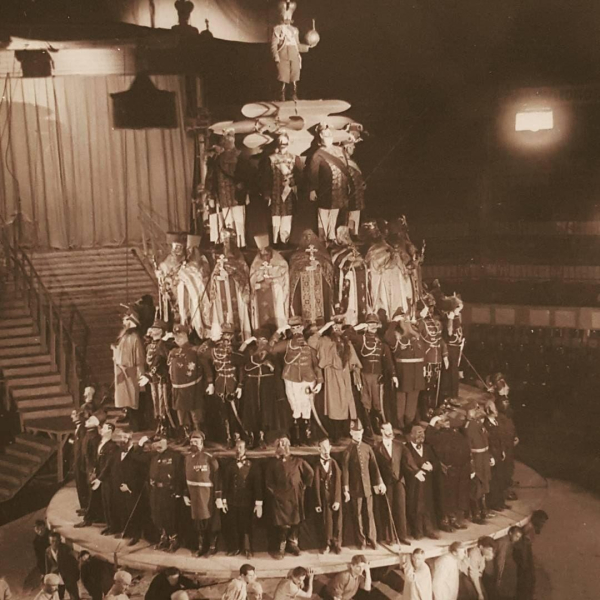 «Пирамида классов» созданная для пантомимы «Москва горит» в Московском цирке по одноимённой книге Владимира Маяковского, СССР, 1930 год.