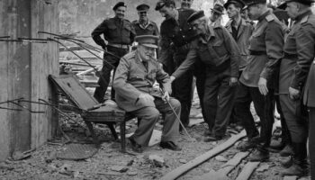 Уинстон Черчилль позирует, сидя на повреждённом кресле из..