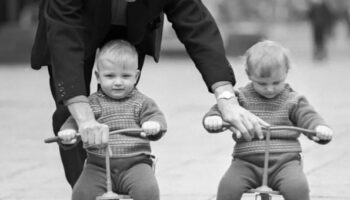 Отец учил своих близнецов кататься на трехколесном велосипеде -..