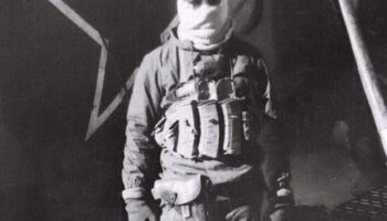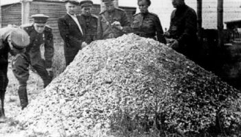 Ошеломленные советские офицеры осматривают огромную кучу..
