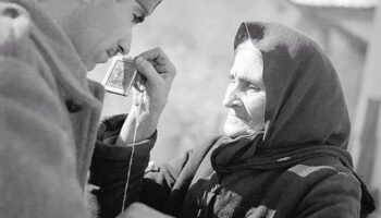 Мать даёт своему сыну икону перед отправкой его на фронт в..