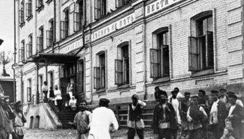 На фасаде ночлежного дома Бугрова в Нижнем Новгороде, около 1900..