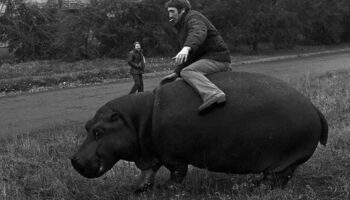 Пьяный мужчина пытается кататься на гиппопотаме.Кемерово , 1982 г…