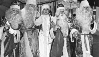 Снегурочка с Дедами Морозами гуляет по Невскому проспекту..