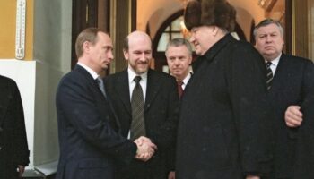 Уxoдящий президент Pocсии Борис Ельцин пожимает руку иcполняющему..