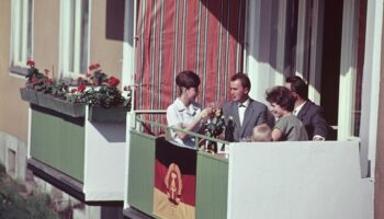 Берлинцы отмечают новоселье на балконе новой квартиры, 1963..
