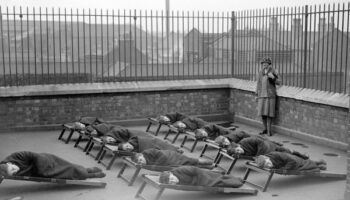 Дети спят на деревянных кроватях под брезентовыми покрытиями..
