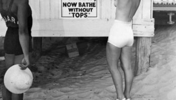 Девушка на пляже объясняет спасателю, почему она загорает без..