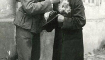 Молодой немецкий солдат пытается унизить пожилого еврея,..