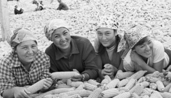 Работницы колхоза «40 лет Октября» с урожаем кукурузы. Казахская..