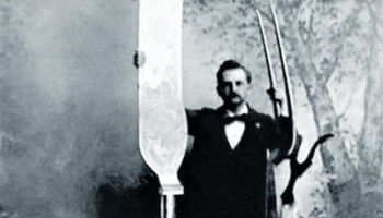 Фотография огромного разделочного ножа и вилки, изготовленных..