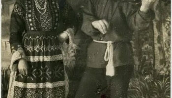Молодая пара в народных костюмах. Вятская губерния, 1916..