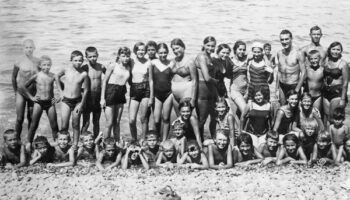 Отряд пионеров с вожатыми и педагогами на морском пляже. Гурзуф ,..
