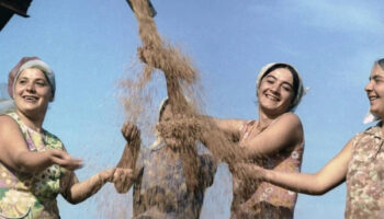 Работницы колхоза «Заря коммунизма», радуются новому урожаю..