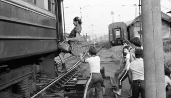 Опаздывающую пассажирку подсаживают в последний вагон . СССР , 1983..