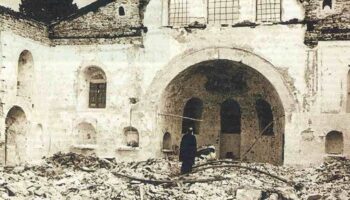 Патриарх Константинопольский Афинагор I стоит среди развалин..