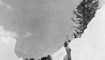 Лыжник Дик Браун перепрыгивает через свой пикап, 1940 год, округ..