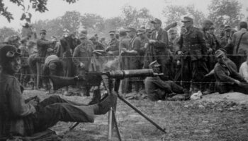 Американский солдат, сидящий у трофейного немецкого пулемета MG..