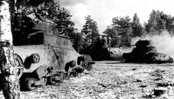 Т-34 с десантом двигаются по полю, на котором в 1941 г. погибли танки..