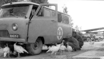 Израильские солдаты чинят трофейный УАЗ. Эль-Ром на Голанах,..