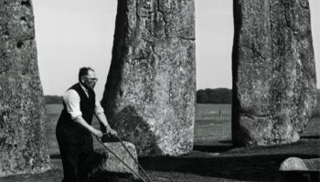 Простой садовник косит траву. Стоунхендж. Великобритания. 1955..