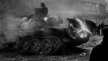 Горящий советский танк на улице Праги, Чехословакия, август 1968..