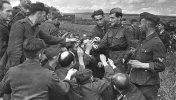 Советский солдат дает папиросы немецким военнопленным. Вторая..