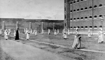 Женщины гуляют со своими детьми в прогулочном дворе тюрьмы..