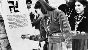 Индейцы племен Навахо, Папаго, Апача и Хопи подписывают документ,..