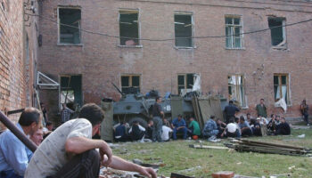 Местные жители и милиция под окнами школы №1, Беслан, 3 сентября..