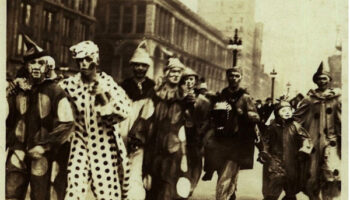 Толпа клоунов идет кого-то веселить (но это не точно), Чикаго, 1918..