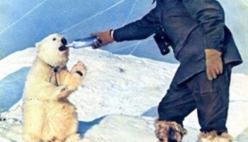 Врач Алексей Гаврилин и медвежонок Огонек на полярной станции СП..