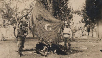 Русские офицеры у трофейного турецкого знамени, 1916 год. Больше..