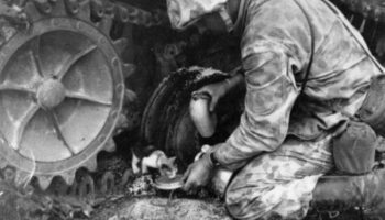 Кинооператор КМП США Норман Хатч поит найденного котенка рядом с..
