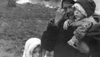 Жительница советской деревни с детьми у сгоревшей хаты…