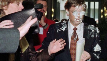 Билл Гейтс после броска в него тортом, Брюссель, 4 февраля 1998..