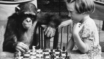 Девочка играет в шахматы с шимпанзе в зоопарке, Лондон, 1955..