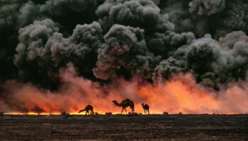 Верблюды в поисках воды на фоне горящих нефтяных месторождений,..