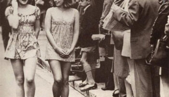 Две девушки в мини-юбках, идущие по улице Кейптауна, 1965..