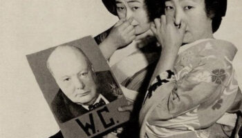 Японские гейши против Черчилля, 1941 год. Две гейши держат портрет..