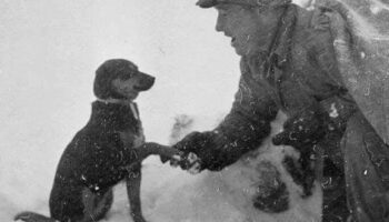 Американский солдат пожимает руку собаке в Люксембурге, битва за..