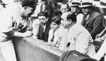 Аль Капоне с сыном на бейсбольном матче в Чикаго, 1931..
