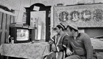 Студенты медресе Мир Араб смотрят выступление Горбачева. Бухара,..