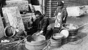 Крестьянин изготавливается ковши на продажу. Япония, 1915..
