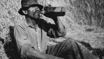Венгерский колхозник выпивает в поле после завершения рабочего ..
