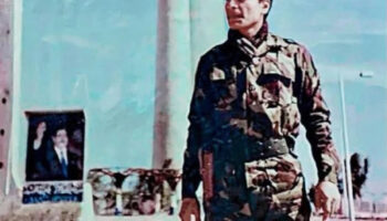 Иракский солдат на фоне портрета Саддама Хусейна. Кувейт, 1990..