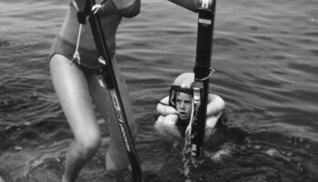 Кирк Дуглас оставляет автограф на бедре девушки. Италия, 1953..