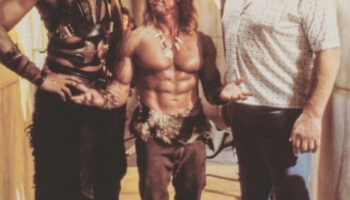 Арнольд Шварценеггер стоит между Андре Великаном и Уилтом..